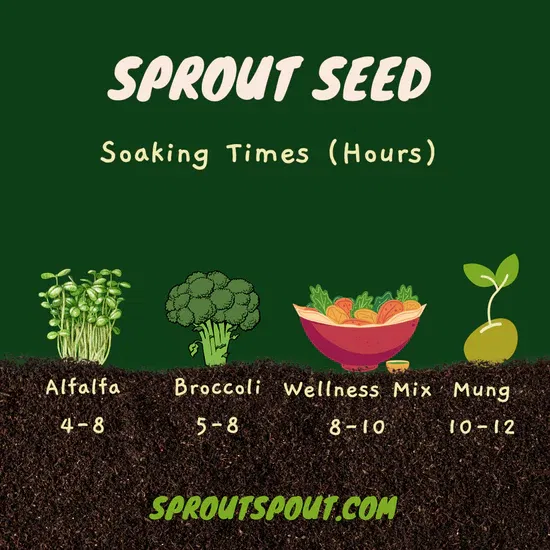 Soaking seeds Is pretty simple but there are a few rules to abide by. If it's a small seed like broccoli or alfalfa, I generally soak them for about 5 to 8 hours. If it's a large seed like mung bean, I soak it for around 12 hours. When you soak your seeds, always put at least 3x the amount of water to seeds as they will grow from water absorption. This is especially important with beans such as mung and garbanzo as they soak up a lot of water. This stage is critical So you want to be sure they get all the water they need during the soaking process. Water is cheap, seeds aren’t, be smart.