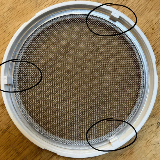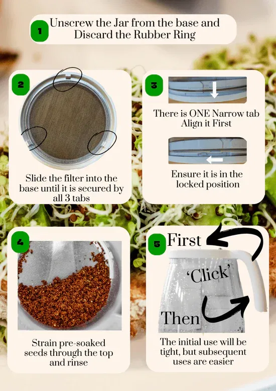 Insert the Stainless steel screen into the bottom of the sprout spout and ensure that it is centered. On your first use, you may have to pry the side opening just a bit until it slides completely into place. Note: The Screen is centered when all three support tabs have direct contact