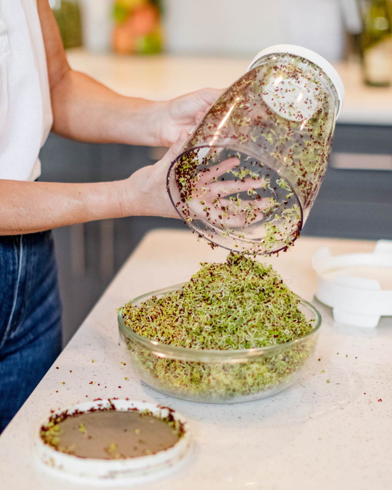 Once your sprouts have their desired look and texture, you simply untwist the base of the jar and slide them into a container of your choice. I find a 1 gallon ziploc with a paper towel in it is an excellent solution. It fits completely around the base and there are no dishes to clean. Remember, convenience is key to keeping things in your routine.