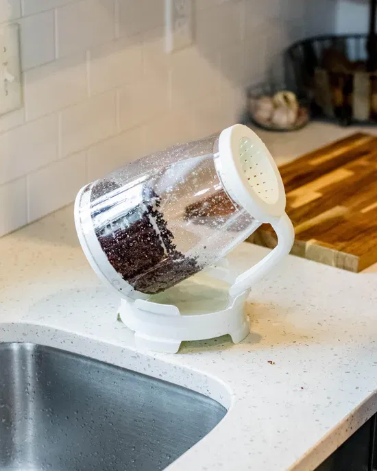 After your seeds have soaked, strain them by pouring them in through the top of the Sprout Spout and give them a quick rinse. Now attach the top of the Sprout Spout by centering it and gently turning it ‘counterclockwise’ till you hear a slight ‘click’. Then proceed to tighten it by turning it ‘clockwise’. Again, the first use is the trickiest as the threads have more friction on their first use. Congratulations! With your soaked seeds deposited and your top and bottom attached securely you have made past the hardest part of sprouting with the Sprout Spout.